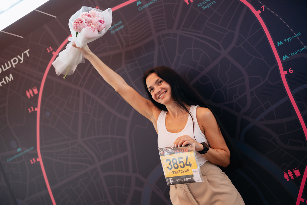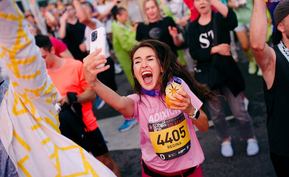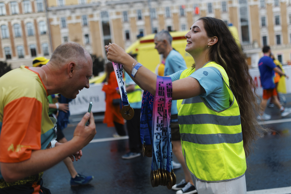 Пожалуйста, не останавливайтесь на линии, продолжайте двигаться дальше. В финишном коридоре вы получите воду и медаль.
